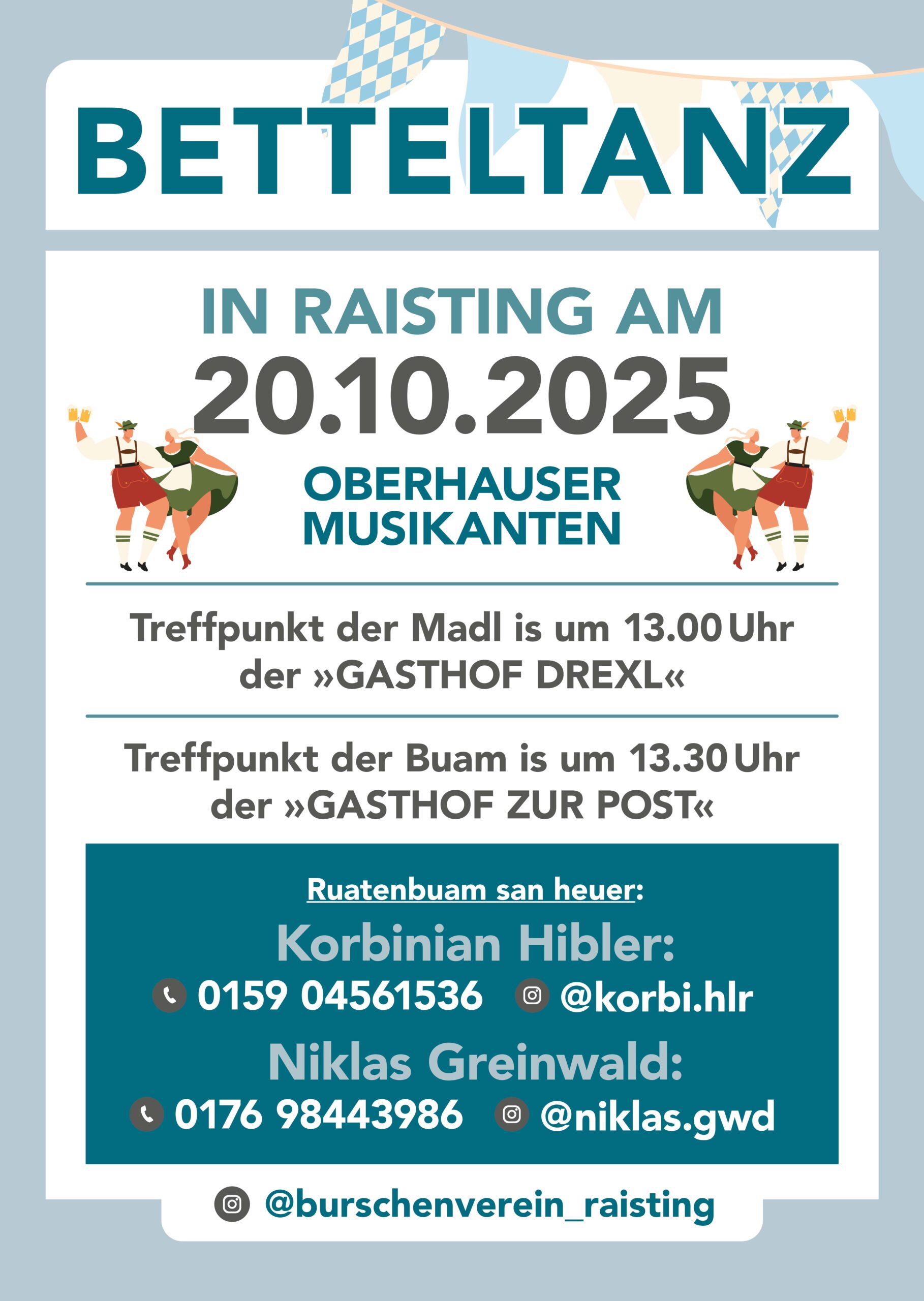 In Raisting findet in Kürze der traditionelle Betteltanz statt. Das beliebte Brauchtumsfest lockt mit Musik, guter Stimmung und einem geselligen Miteinander im Gasthof zur Post. Die Tanzfläche steht allen offen – ob allein oder als Paar.